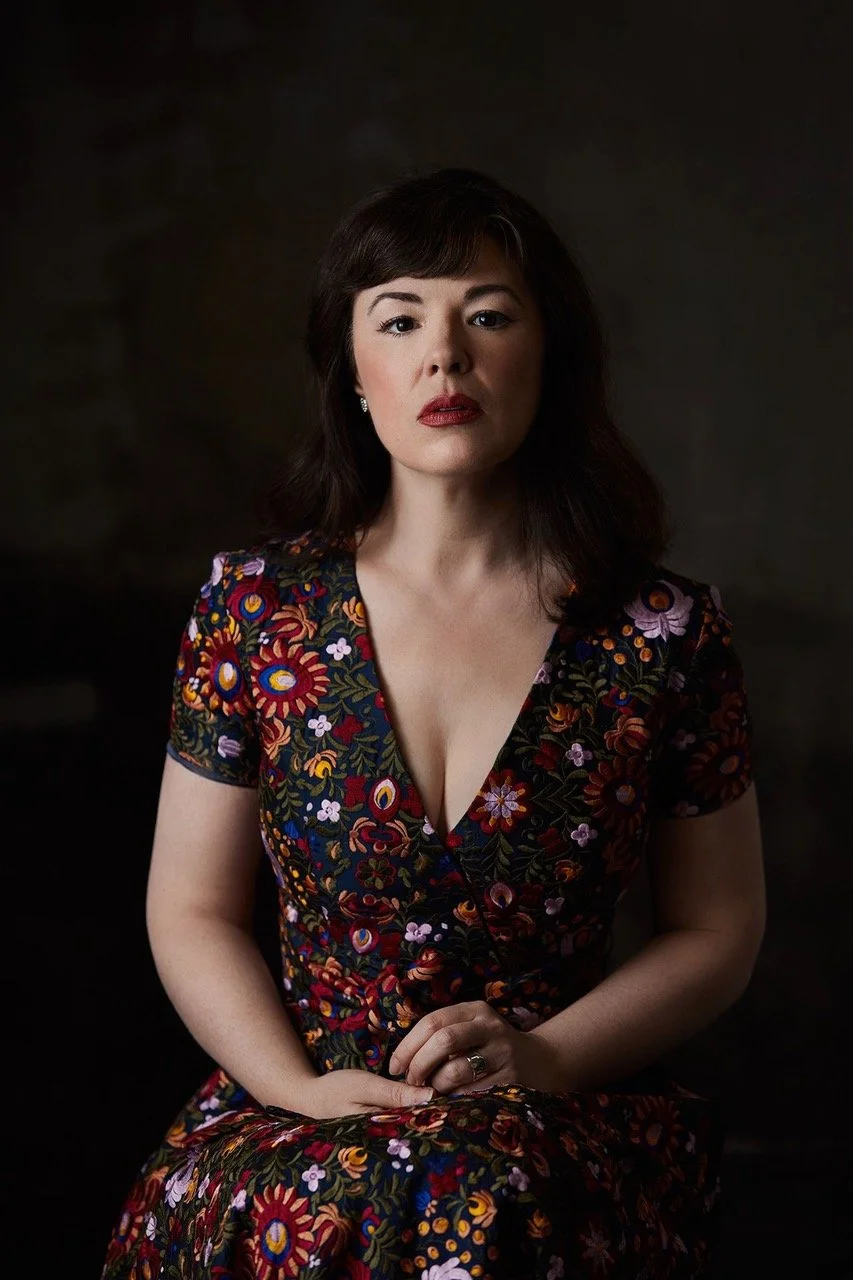 Image description: A white woman with shoulder length dark hair and dark eyes, wearing a multi-coloured floral dress with a deep v-neck. She is sitting facing the camera with her hands in her lap. Her lips, painted a deep red, are slightly parted as she looks intently at the camera.