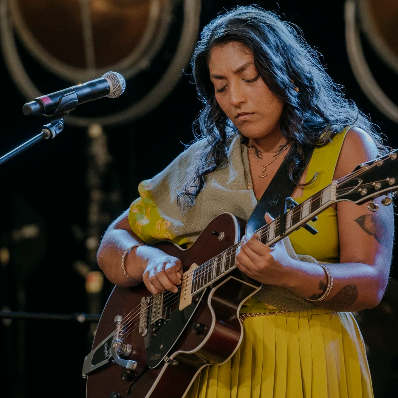 [Image description: A woman with brown skin and long dark hair wearing a yellow sleeveless dress. She plays a guitar on stage.]
