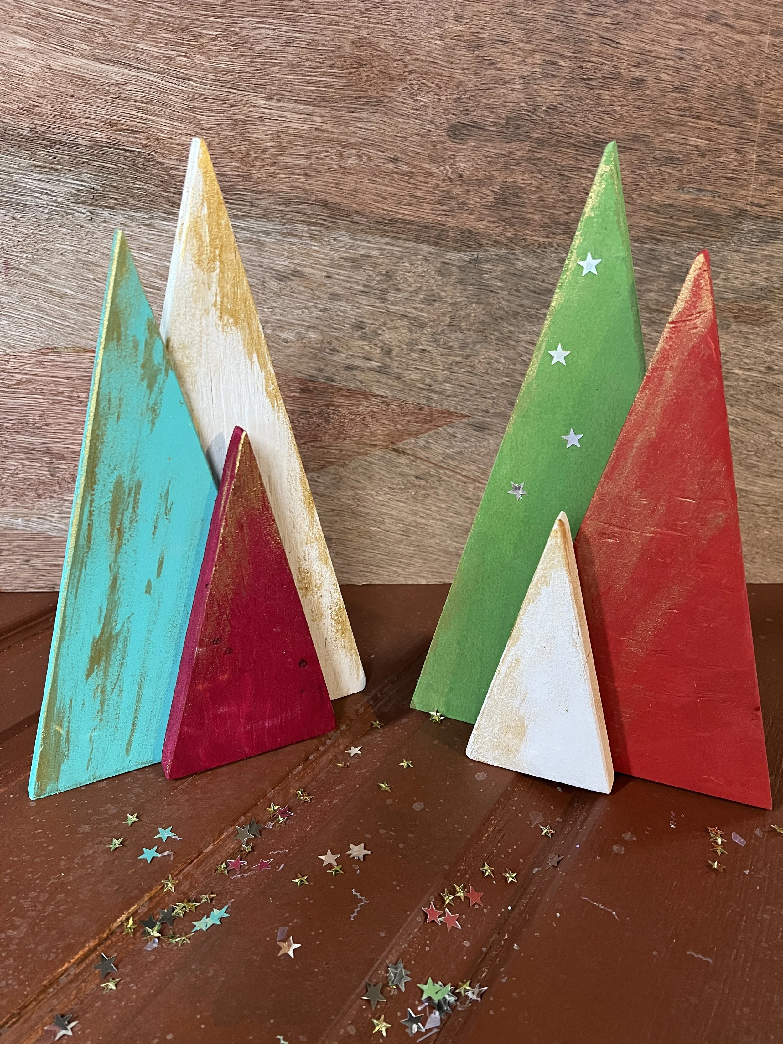 [Image description: Two holiday decorations side by side, made of three overlapping triangles painted in shades of red, white and green and decorated with silver and gold stars.]