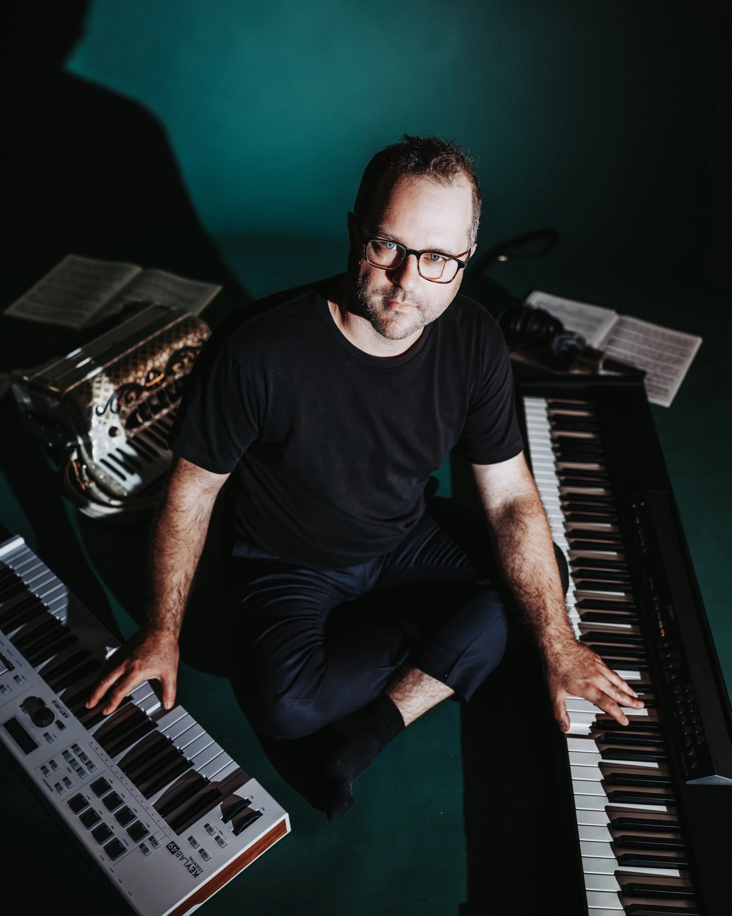 [Image description: A white man with short hair and glasses, wearing a black t-shirt . He sits o n the floor, his hands resting on the keys of two keyboard which are on the floor on either side of him. ]