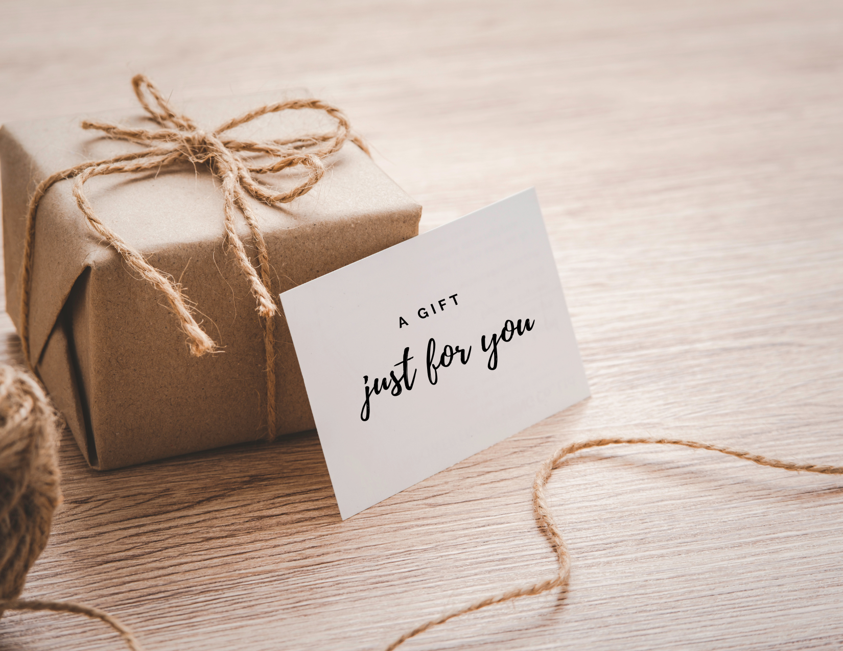 A small present wrapped in brown kraft paper and tied with twine sits on a wooden surface. A white card leaning against the gift reads “a gift just for you”.