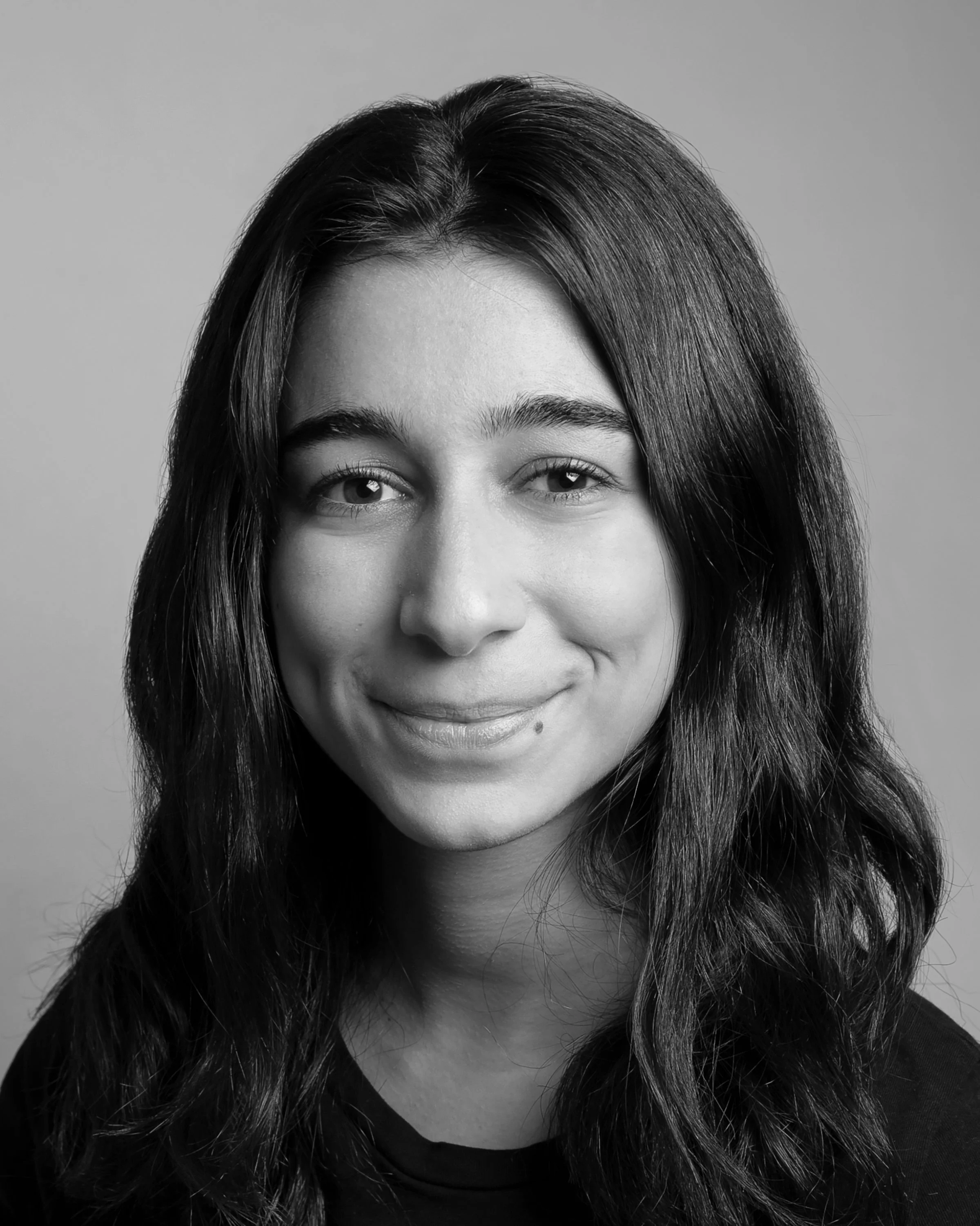 [Image Description: a person shoulder length dark hair smiles at the camera; they are wearing an ivory-coloured blazer over a black shirt, standing in front of a black background.]
