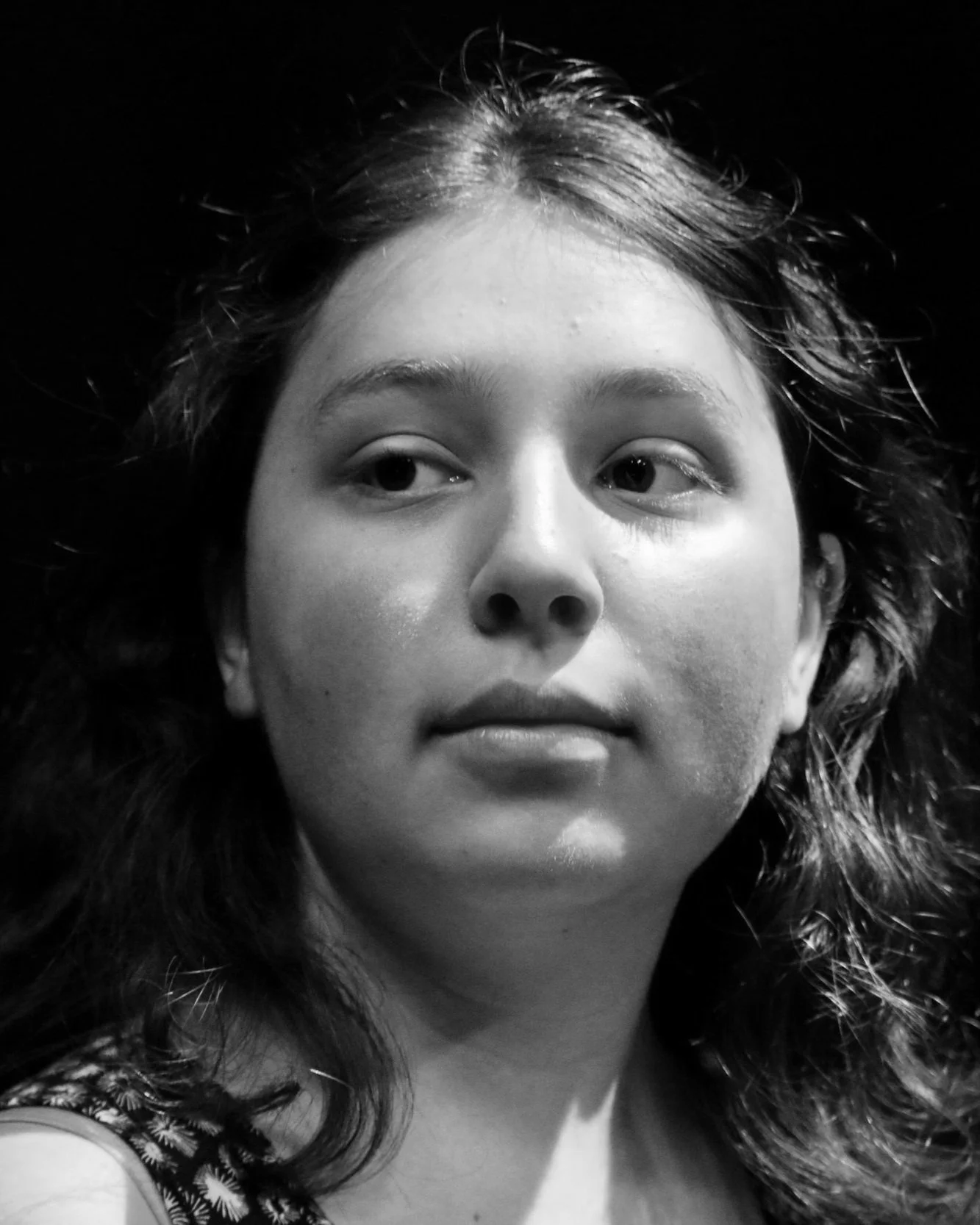 [Image Description: a black and white photo of a youth with shoulder length brown hair and wearing a white sweater. She stands, smiling slightly with her head titled.]