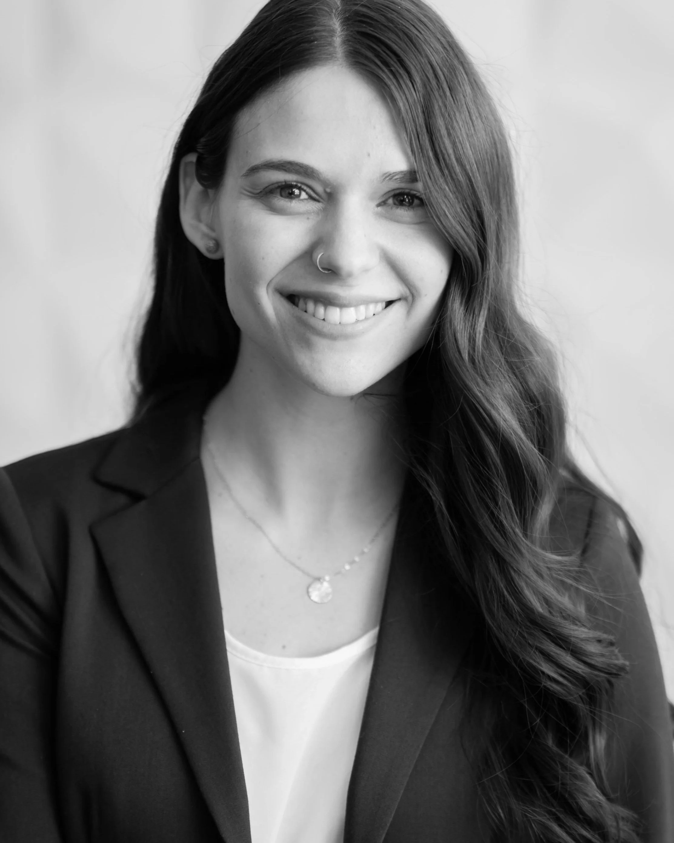 Image Description: A black and white photo of a person, Sarah, who has their hands on their knee, one crossed over the other. They are wearing a polka dotted button up shirt and have curly hair. They are looking intently at the camera.