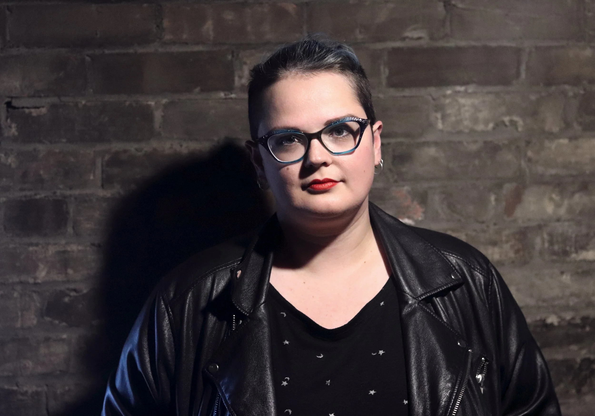 Image Description: A photo of Donna-Michelle, who has dark cirly hair, and is wearing a black hoodie, earrings, and dark rimmed glasses. They are standing in front of a yellow wall, being filmed by a video camera. They are looking intently off to the left of the photo.