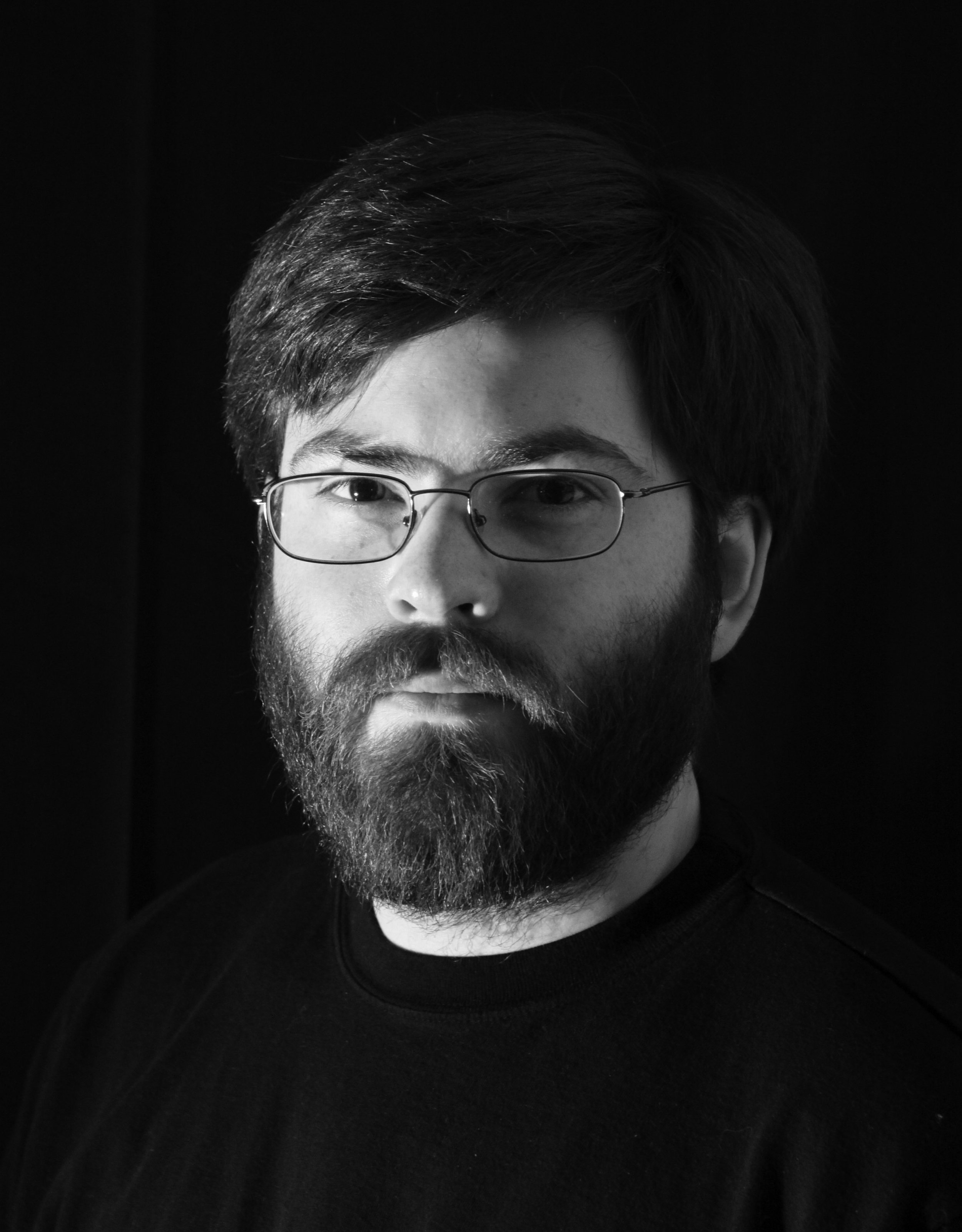 Image Description: A photo of Cameron, who has short dark hair and a beard, and is wearing wire-rimmed glasses. They are wearing a black shirt and is looking intently at the camera.