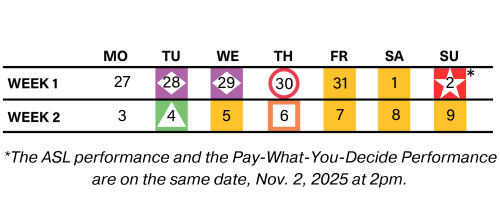 [Image description: A two week calendar with performance types and associated dates. Both the ASL performance AND the Pay What You Decide performance fall on November 2.]